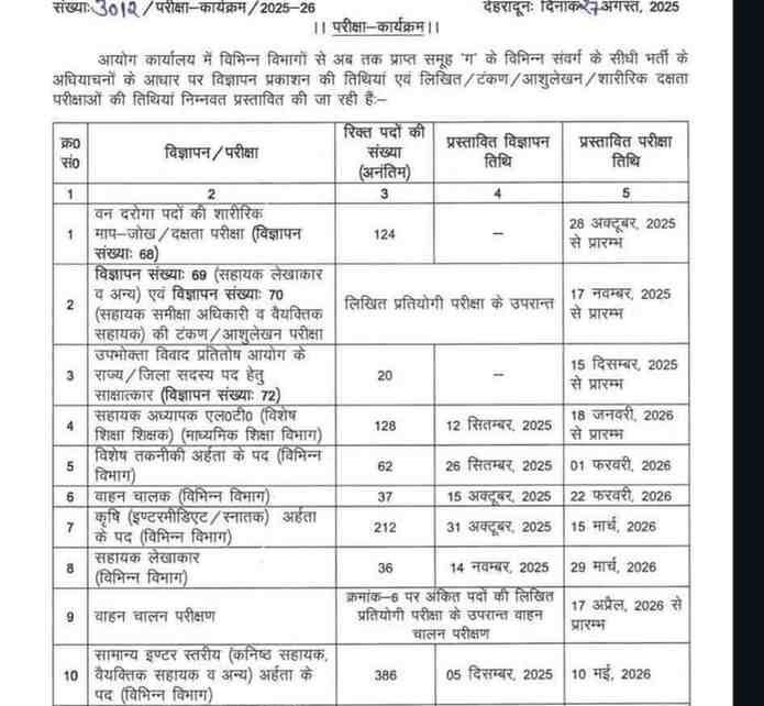 उत्तराखंड में सरकारी नौकरी की तैयारी कर रहे युवाओं के लिए बड़ी खुशखबरी है। उत्तराखंड अधीनस्थ सेवा चयन आयोग (UKSSSC) ने वर्ष 2025-26 के लिए वार्षिक परीक्षा कैलेंडर जारी कर दिया है। इस कैलेंडर के तहत आयोग समूह ‘ग’ के अंतर्गत विभिन्न विभागों में सीधी भर्ती के लिए 14 बड़ी परीक्षाएं आयोजित करेगा। यह भर्तियां अक्टूबर 2025 से जून 2026 तक प्रस्तावित हैं।